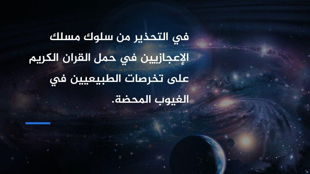 فهب أن الله عز وجل ذكر أن العالم يتوسع مثلًا، والكوزمولوجيين ذكروا أن العالم يتوسع، فمن أين لك أن التوسع الذي قصده الله سبحانه في كتابه هو نفس التوسع الذي يتكلمون عنه بنفس التفاصيل ولنفس الأسباب والأقيسة!